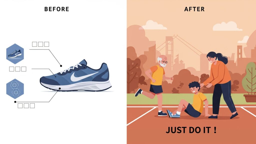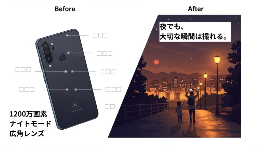 「売れる伝え方」ってなに? 「伝え方」が変わると、成果が変わる。 たとえば── ・EC商品ページの写真構成を変えただけで、クリック率が2倍に。・トップコピーを数行書き換えただけで、成約率が1.6倍に。 「売れる伝え方」とは、感覚ではなく“構造”を変えること。以下では、世界的なブランドがどのように「伝え方」を変えて成果を出したか、有名な3つの例を通して紹介します。 01|Apple:スペックから“体験”へ Before 1GBのMP3プレーヤー 容量・機能といったスペック中心の伝え方。数字では伝わるが、ワクワクしない。 After 1,000 songs in your pocket(1,000曲をポケットに) 音楽を持ち歩く“体験”そのものを表現。一気に商品が「ライフスタイル」になる。 数字 → イメージに変えたことで、記憶に残るコピーになった。 02|NIKE:製品説明から“感情”へ Before 「軽量素材」「高反発ソール」「スピード重視設計」 スペックの列挙だけでは心に響かない。 After Just Do It CMでは、高齢者が再びジョギングに挑戦する姿や転んだ子どもを母が励ますシーンを描き、誰かの物語に。私たちが勇気づけられる。 機能 → 人の感情に寄り添うストーリーに変えた。 03|Google Pixel:性能から“記憶”へ Before 1200万画素・ナイトモード・広角レンズ 高性能なのに、心に届かない。 After 夜でも、大切な瞬間は撮れる。 祖父母と孫の笑顔、夜の家族との会話、“写したい気持ち”に寄り添ったコピーとCM。 機能 → 人生の一瞬を切り取る感情体験に変えた。 あなたの商品だったら、どう伝える? 例えば… Case.01 野菜スープ(冷凍) Before After Before 「国産野菜100%・無添加・冷凍保存可」などの特徴だけでベネフィットまで届かない。画像も「野菜の山」「スープと小物」などで情報は伝わるが「おいしそう」止まり。 After <写真で>・子どもが「もう一杯!」とおかわりする瞬間を切り取る。・ぶっとんだ量の野菜を背景にして目を引くビジュアルに。また「野菜たっぷり感」の印象を伝える<コピーで>・「子どもが飲み干す、安心のスープ」 「どんな素材か」よりも「この子に安心して食べさせられる」というベネフィット Case.02 キャベツ専用ピーラー Before After Before 「刃カバー付・アップグレード版・送料無料」と、特徴が伝わらない。画像も商品だけで使用感や体験が見えない。 After <画像で>・滝のようにあふれる千切りの手元アップ画像を撮影<CTA文で>・ふわふわ千切りを体験する<広告で>・大きなキャベツにピーラーをすべらせるたび、極薄の千切りがどんどん積み上がるショート動画。・手元のアップと“山盛りの量感”が「プロ並みのふわふわが、誰でも・すぐに」を一目で伝える。 機能ではなく 「食卓が変わる体験」 をビジュアルで届ける。 「機能を伝える」から「暮らしや気持ちが変わる」を描けたとき、 あなたの商品にも“選ばれる理由”が生まれます。 「どんな言葉で伝えるか」だけでなく、「どう見せるか」「どんな場面で届くか」まで含めて考えると、きっと伝え方は大きく変わってくるはずです。 利用シーンやターゲットで「伝え方」は多角的に変化していきます。だからこそ、「何をどう伝えるか」に迷うのは当然です。 今すぐ相談する 伝え方、見直したいと思ったら 「売れる伝え方」は魔法ではありません。けれど、少しだけ視点を変えれば── 伝え方は、“誰に”“何を”“どう”届けるか、という設計図。 お客様の目線から組み立て直せば、自然と伝わり方が変わります。 あなたの伝え方、今どんな状態ですか? チェックしてみましょう。あなたの「伝え方」、こうなっていませんか? あなたの商品、「ここが魅力」「これが価値」など特徴の押し売りになっていませんか? お客様の頭の中に、体験のシーンや空気感が浮かびますか? サイト・広告・SNS…バラバラな印象になっていませんか? 「伝え方の手段」──本当に合っている方法を選べていますか? 写真や動画、漫画やLP…誰のために・どの順番で届けていますか? ・・・いくつか迷ったなら、それは「伝え方を整える」絶好のタイミングかもしれません。 伝えることで、届けられる人が変わる まだ知られていない良さを、必要な人にきちんと届ける。それが、私たちが考える「売れる伝え方」です。そして伝え方には様々な方法があります。 動画 LP 広告 漫画 サイト構築/設計 導線 などなど…あなたの商品にも、まだ“伝えきれていない価値”が眠っているかもしれません。あなたに合った方法で、その「もったいない」を、伝わるカタチにしませんか? 今すぐ相談する “売れる伝え方”でこんなに変わる 指標 改善幅(目安) 備考 コンバージョン率(CVR) ↑ 1.5〜3倍 LPや商品ページ、広告などに導入した場合の代表指標。CTAが明確になるため。 直帰率 ↓ 10〜30%改善 メッセージが明確になり、離脱を防げる。特にファーストビューの改善で顕著。 平均滞在時間 ↑ 20〜80%増加 ストーリー仕立てで構成されるため最後まで読んでもらいやすくなる。 メール開封率 ↑ 10〜25%増加 タ